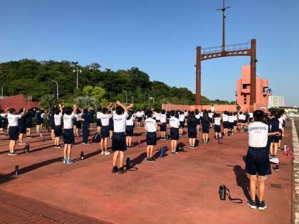 朝のつどいです。みんな健康状態も良いです。代表生徒から朝のあいさつがありました。「今日も一致団結してみなさんがんばりましょう!」その後、2回目のラジオ体操では大きな声と力強いからだの動きを出すことができました。今日も一日頑張っていきましょう。