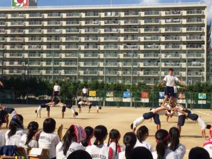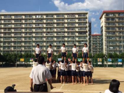3年男子による、組体操です。太鼓の合図で一人から二人、三人、五人と組が変わっていきます。