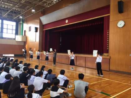 生徒会交流会で「いじめ」について取り組んだことを報告し、「いじめ」を止めるためにどうすればよいかを話し合い、スローガンを作成しました。