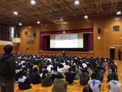健康集会を「スマホと健康について」というテーマで行いました。前期・後期の健康委員がスマートフォンが脳や学習に与える影響などを調べ、発表しました。