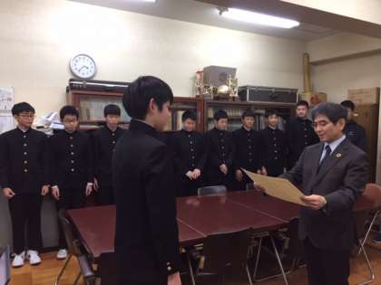 稲嶺平野区長が来校され、本年度の夏に全国大会に出場した男子ソフトボールが表彰されました。暑い日も寒い日も努力したことが全国大会出場につながりました。