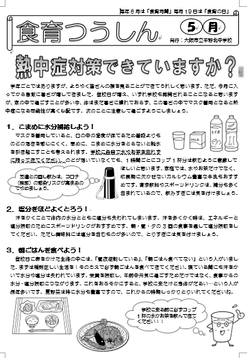 こまめに水分を取り、登校する際は各自で水やお茶を忘れないように持参してください。