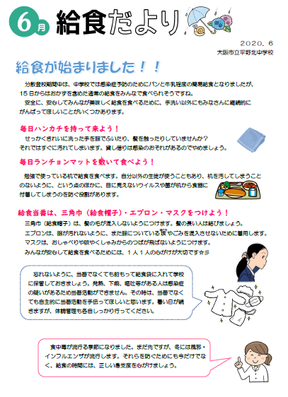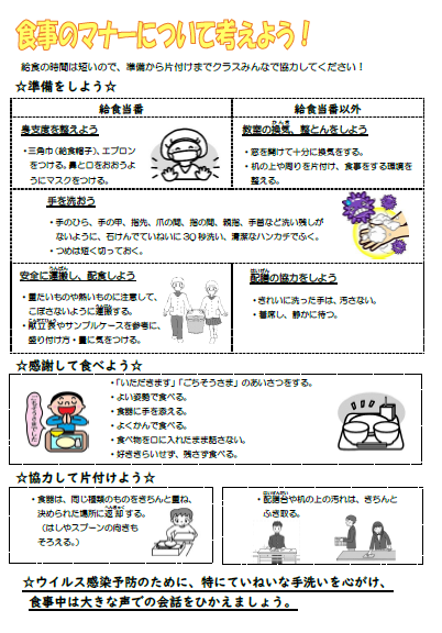 衛生的な給食指導のため、当番時に使用する三角巾(給食帽子)、エプロン、マスクのご用意をよろしくお願いいたします。各学級で12日(金)までに全員持ってくるよう連絡しています。色や柄、形は問いません。