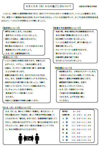 学校での過ごし方について本日配付されたプリントをもう一度確認して、来週からの通常授業再開に備えましょう。