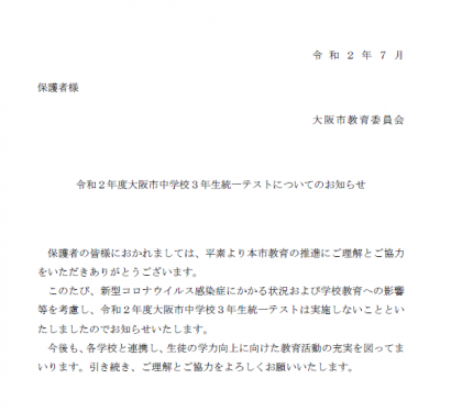 令和2年度 大阪市中学校3年生統一テストについてのお知らせが、大阪市教育委員会から届きました。