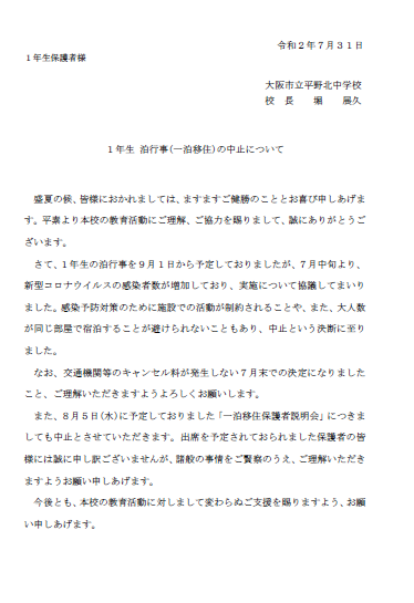 伴いまして8月5日の「一泊移住保護者説明会」も中止とさせていただきます。諸般の事情をご賢察のうえ、ご理解いただきますようお願い申しあげます。
