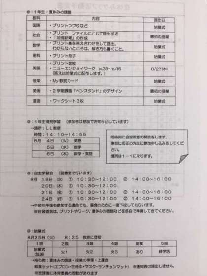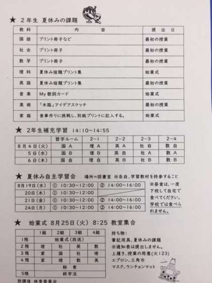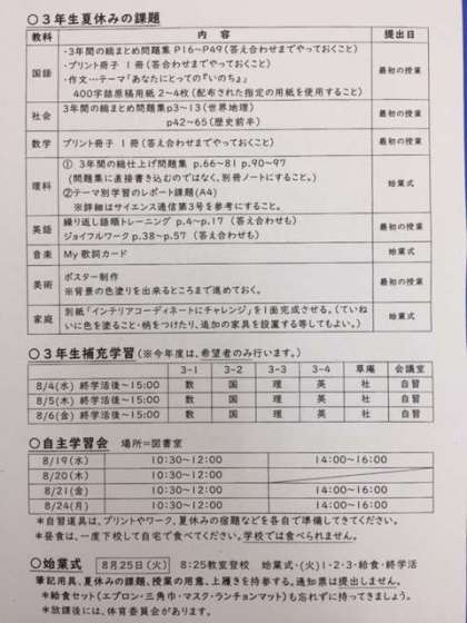 夏休みの課題・時間割・持ち物など確認しましょう。この日から授業を実施し、給食もあります。