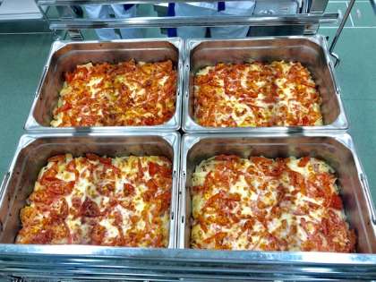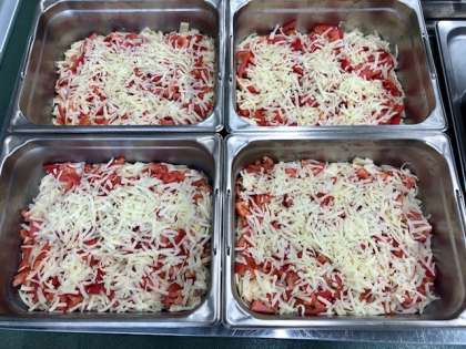 毎回生徒に好評なチーズ焼きは、材料をクラス分ずつこのミニバットに入れて、焼き物機で焼いています。本日残食ゼロでした!