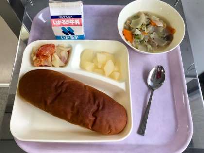 今日の献立は、「黒糖パン、牛乳、鶏肉とてぼ豆のスープ煮、じゃがいもとトマトのチーズ焼き、和なし(カット缶)」でした。