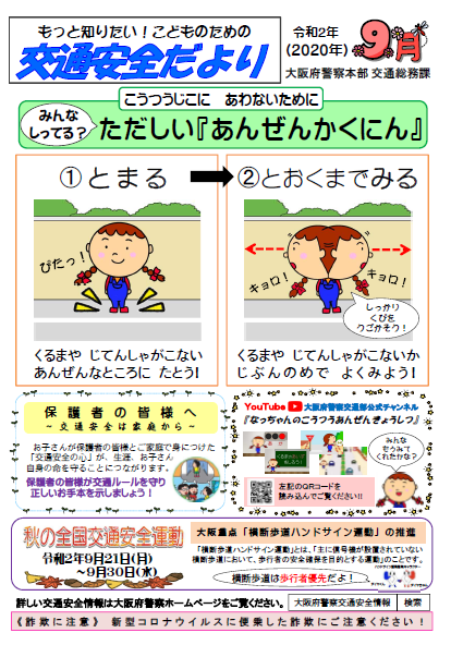 秋の全国交通安全運動がまもなく始まります(9月21〜30日)。引き続き交通ルールを守り、交通事故にあわないようにしましょう。