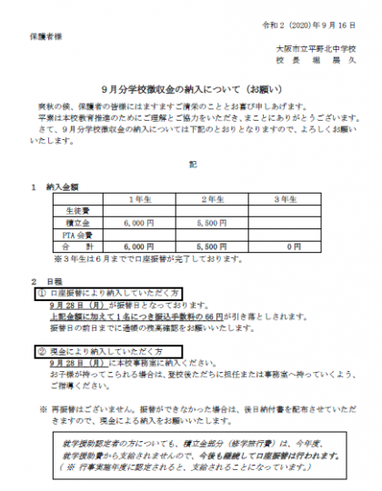 なお、現金で納入される方は、9月28日(月)までに学校事務室にお納めください。