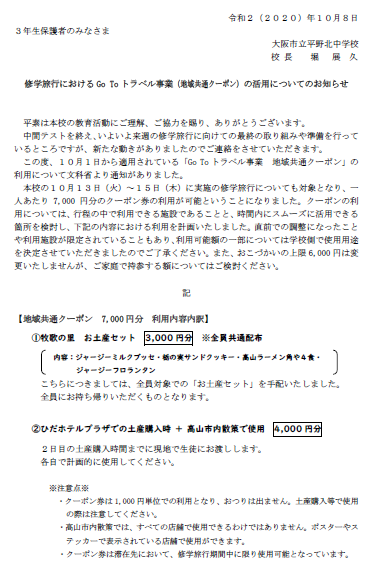 10月1日から適用されている「Go To トラベル事業 地域共通クーポン」の通知があり、本校の修学旅行も対象となるため、一人あたり7000円分のクーポン券が利用できることになりました。