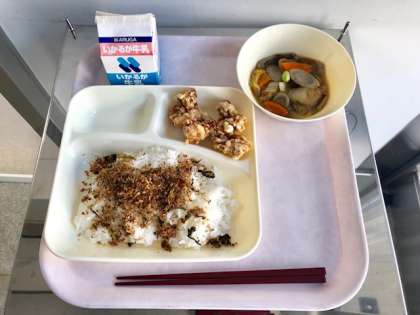 今日の献立は、「ごはん、牛乳、鶏肉のたつたあげ、あつあげと野菜の煮もの、おかかなっ葉」でした。