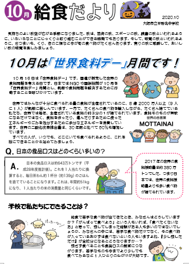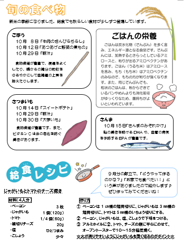 給食にも秋から冬にかけて旬の食べ物が次々登場しています。味覚の秋を楽しみましょう。
