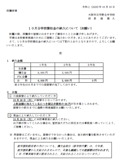 なお、現金で納入される方は、10月26日(月)までに学校事務室にお納めください。