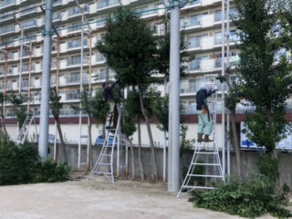 運動場の東側及び北側、玄関口周辺など広範囲に及びます。防球ネットと入り組んだ所や高くて難しい所なども丁寧に作業が行われています。立冬も過ぎ、風も厳しい中、学習環境を整えていただいており誠にありがとうございます。
