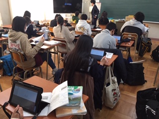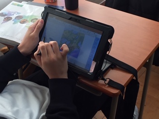 タブレットパソコンを使い、近畿地方について調べています。パワーポイントを使ってまとめ、発表します。