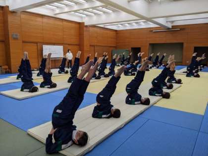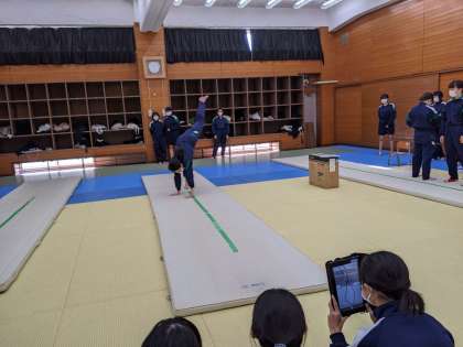 タブレットで撮影された自分の試技(倒立と側方倒立回転)を客観的に観察し、課題をみつけます。学習カードに気づきや達成状況を記録し、段階的に練習しています。