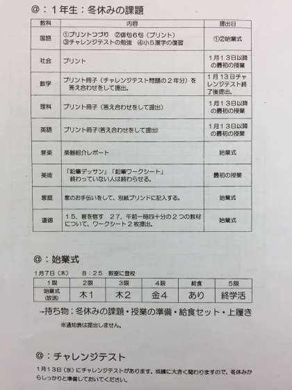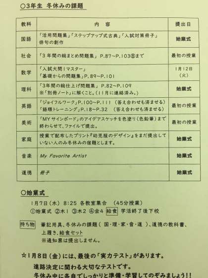 冬休み明けには、3年生実力テスト[1/8(金)]、1・2年生チャレンジテスト[1/13(水)]にあります。計画的に学習を進めましょう。勉強計画ノートも活用しましょう。