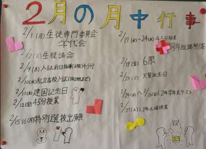 2月になりました。2月の別名は、如月(きさらぎ)と呼びます。今年は、立春が2月3日です。春が近づいていますが、寒い日も多いです。2月10日には京阪神の私立高校の入学試験があります。体調管理は万全に!
