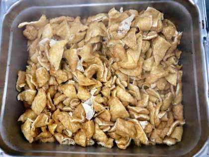 大阪市の給食では、きつねうどんをイメージして、三角に切って甘辛く煮たうすあげと、かまぼこ、青ねぎをとりあわせ、とろろこんぶを添えたうどんを「なにわうどん」と呼んでいます。