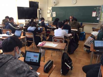 一人に一台キーボード付きのタブレットパソコンが配置されています。インターネットにつなぎ、それぞれ職業について調べています。ディズニーランドで働きたい、でも大変そうなど…の声が聞こえてきます。