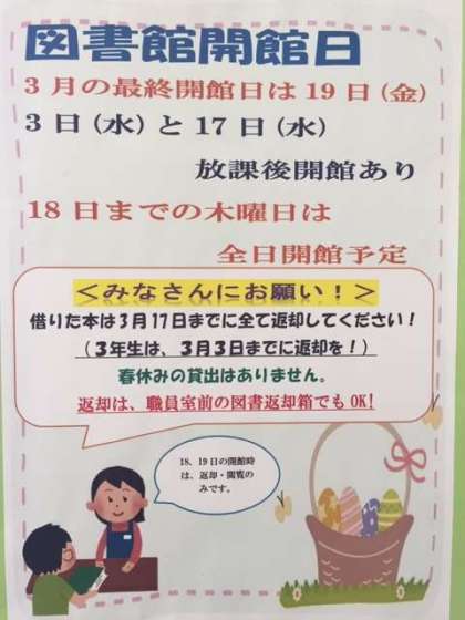 年度末になりました。図書館の本を借りている人は、返却してください。図書館をあまり利用したことのない人は、昼休み・放課後に行ってみましょう。