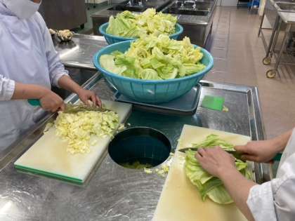2枚目の写真はキャベツを手切りしているところです。真ん中に穴が空いていて切ったものを籠でうけ、調理作業がしやすいように作られています。