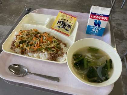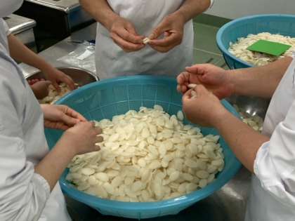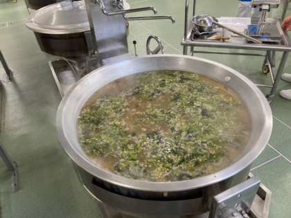 今日の給食に使われているトック(韓国の餅の名前)は湯でてくっつかないように給食調理員さん10人のうち4人でトックがくっついているのを一つ一つはがして作業してくれていました!