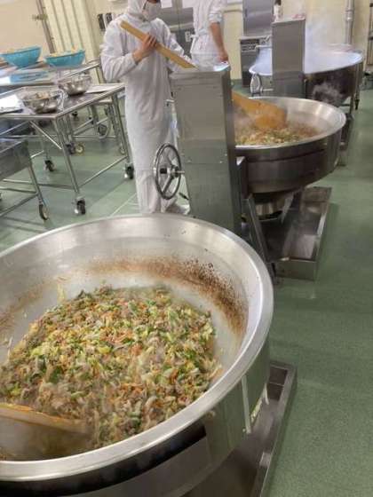 給食で作る焼きそばは、1釜では作れないので、今日は2つの釜に分けて作ってくれていました。麺の茹で時間は約5秒〜10秒にし、野菜から出る水分で麺をほぐしていきます。生徒が食べる頃にはちょうど良い麺の硬さに仕上がっていました!今日のおかずは全て大好評でした!