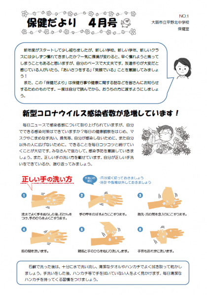 保健だよりでは、保健行事や保健に関する話などを皆さんにお知らせしていきます。一度は自分で読む習慣をつけてくださいね!また、新型コロナウイルス感染者数が急増しています。自分でできる感染対策を毎日続けていきましょう。