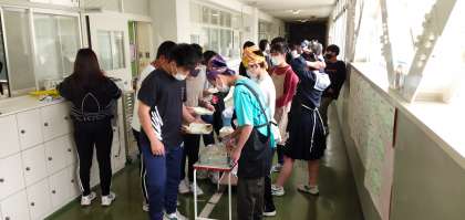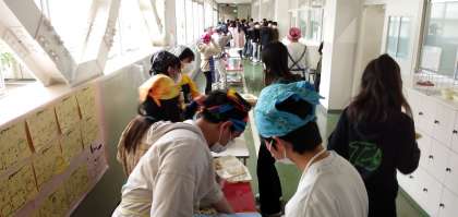 感染予防対策をとりながら給食を配膳しています。3年目になった3年生は当番が協力しながらてきぱきとこなしています。