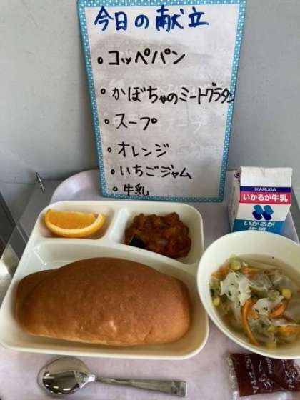 給食では、6〜10月に国産の西洋かぼちゃをカレー、シチュー、みそ汁、甘みつかけなどで使用しています。