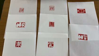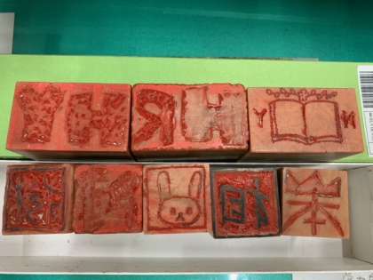 特別講習会の2日目は篆刻です。初めて持つ印刀にドキドキしながら、楽しく作品を作りました。