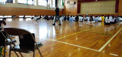 今日の3年生集会では正岡先生から、コロナ渦での生き方について話がありました。登校していない生徒もリモートで参加しています。