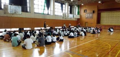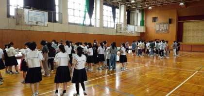 本日6限目に、3年生は修学旅行の班分けの確認をしました。修学旅行ではホテルの部屋やラフティングや食事や琴平散策など、様々なグループに分かれます。まだまだ暑さの残る体育館でしたが、お互いに確認しながら楽しそうに取り組んでいました。