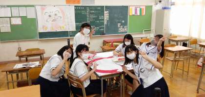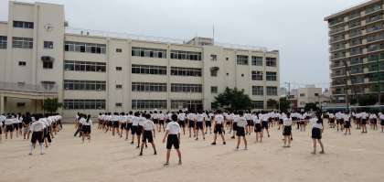 本日、5・6限目を使って体育大会の全体練習が行われました。全校生徒が運動場に集まり、開閉会式の流れの確認やラジオ体操を練習しました。さらに各学級では学級旗の制作が始まっています。放課後の時間を使ってオリジナルの旗を作っています。