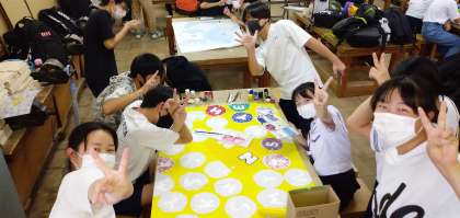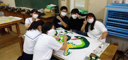 技術室を使って、3年生の各クラスの学級旗作りが順調に進んでいます。