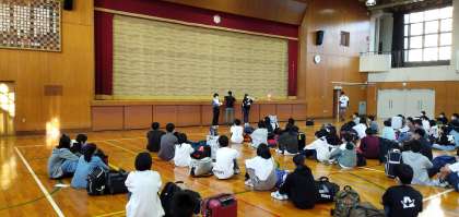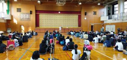 健康観察や持ち物確認、実行委員のあいさつ、校長先生のあいさつ、添乗員さん・写真屋さんの紹介など、出発式を行いました。いよいよ修学旅行が始まりました。気をつけて行ってきます!