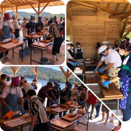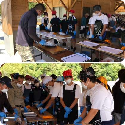代表生徒の挨拶の後、班に分かれ、新鮮なカツオをさばいていきます。