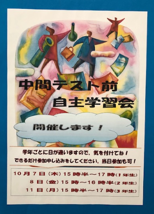 中間テスト前自主学習会を開催します。 時間がある人は、参加してくださいね。