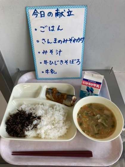 年に一回給食に登場するさんまが今日はでました。生徒たちは骨を取り除いて食べるのが一苦労しましたが、脂がのっていて美味しかったです。さんまは毎年国産を仕入れていましたが、今年は漁獲量の低下で台湾産になりました。