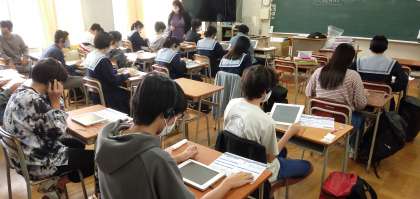 本日3年生は大阪市英語力調査に取り組みました。3時間を使ってリーディング、リスニング、ライティング、スピーキングの問題を解きました。スピーキングの調査では、タブレットやヘッドセットを使って音声を録音しました。