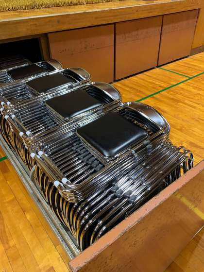 現在、使用していますパイプ椅子の経年劣化により、椅子の座面や支柱に破損が見られるものについて更新を行うため、今回、新たに80脚購入しました。