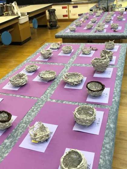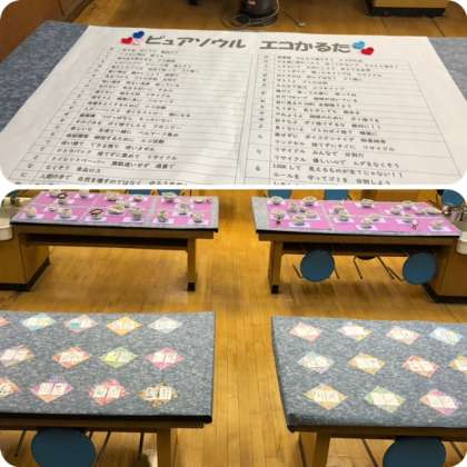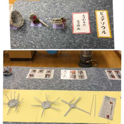 四者活動のピュアソウルでは、エコかるた(読み札と絵札)と新聞で作るかごを作成しました。