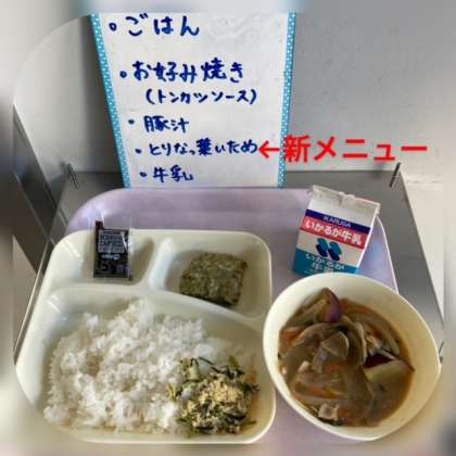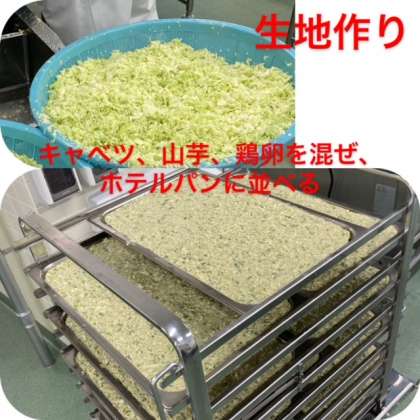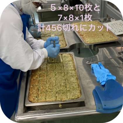 お好み焼きは生地をつくり、焼き物機で15分焼いた後、人数分にカットしていきます。今日は3人の調理員さんでカットしました。