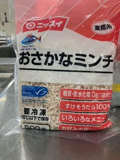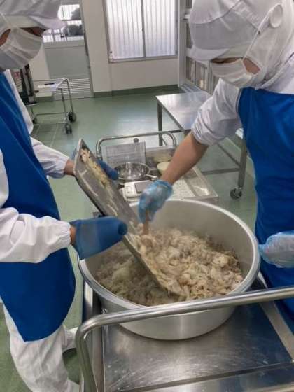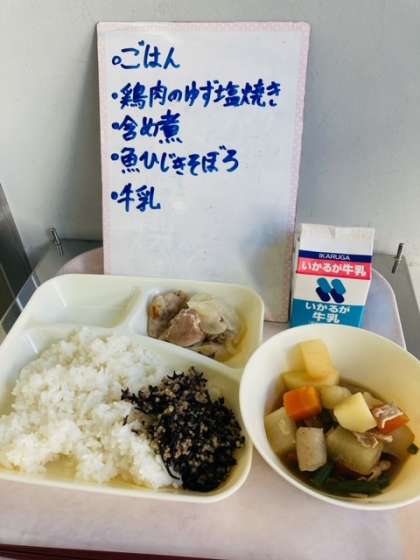 今日の給食には新食品の魚そぼろを使っています。原材料は白身魚のスケソウダラをミンチにしたものです。それを魚ひじきそぼろのふりかけをつくりました。