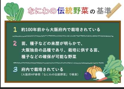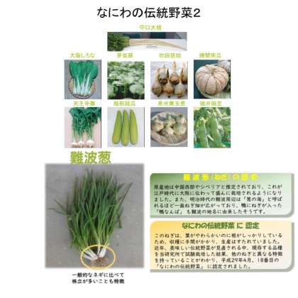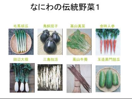 大阪市の給食では金時人参と田辺大根がつかわれます。なにわ伝統野菜は写真の通り、計18種類あります。