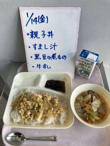 今日の献立は、親子丼、牛乳、すまし汁、黒豆の煮ものです。