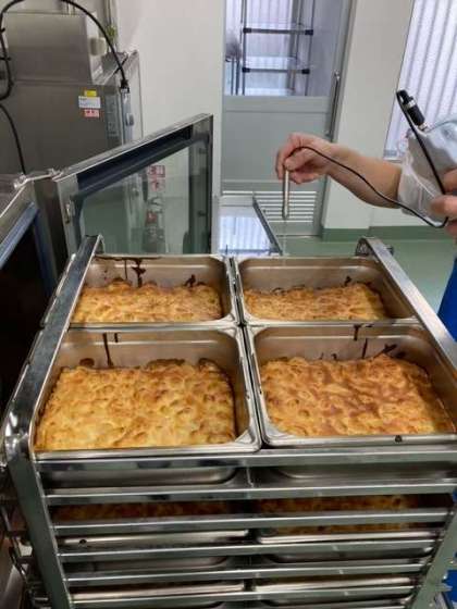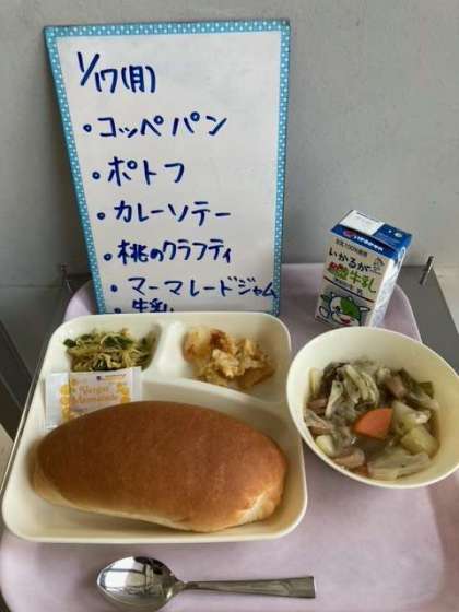 今日の給食では牛肉とウインナー、じゃがいも、キャベツ、にんじん、パセリを使って、食べやすい大きさに切ってから煮込んでいます。